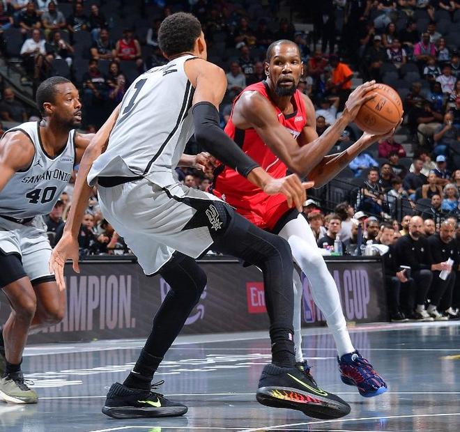 防守端马刺也是不给火箭任何大空位机会,想拿到一个轻松出手的投篮都很难。对杜兰特马刺采取和灰熊同样策略,就是无限夹击。杜兰特作为火箭的进攻箭头人物,出球能力不足一直是他的老毛病,他需要外线有另一个强大的牵制点,就像当年在勇士时有库里那样的射手分担压力。但火箭没有那样的牵制力,于是杜兰特压力极大,加上年龄上来,有心无力啊。可能上谢泼德时会好一些,但一旦火箭切换到五大阵容,马刺的夹击就变得肆无忌惮,火箭缺乏有效的破解手段。